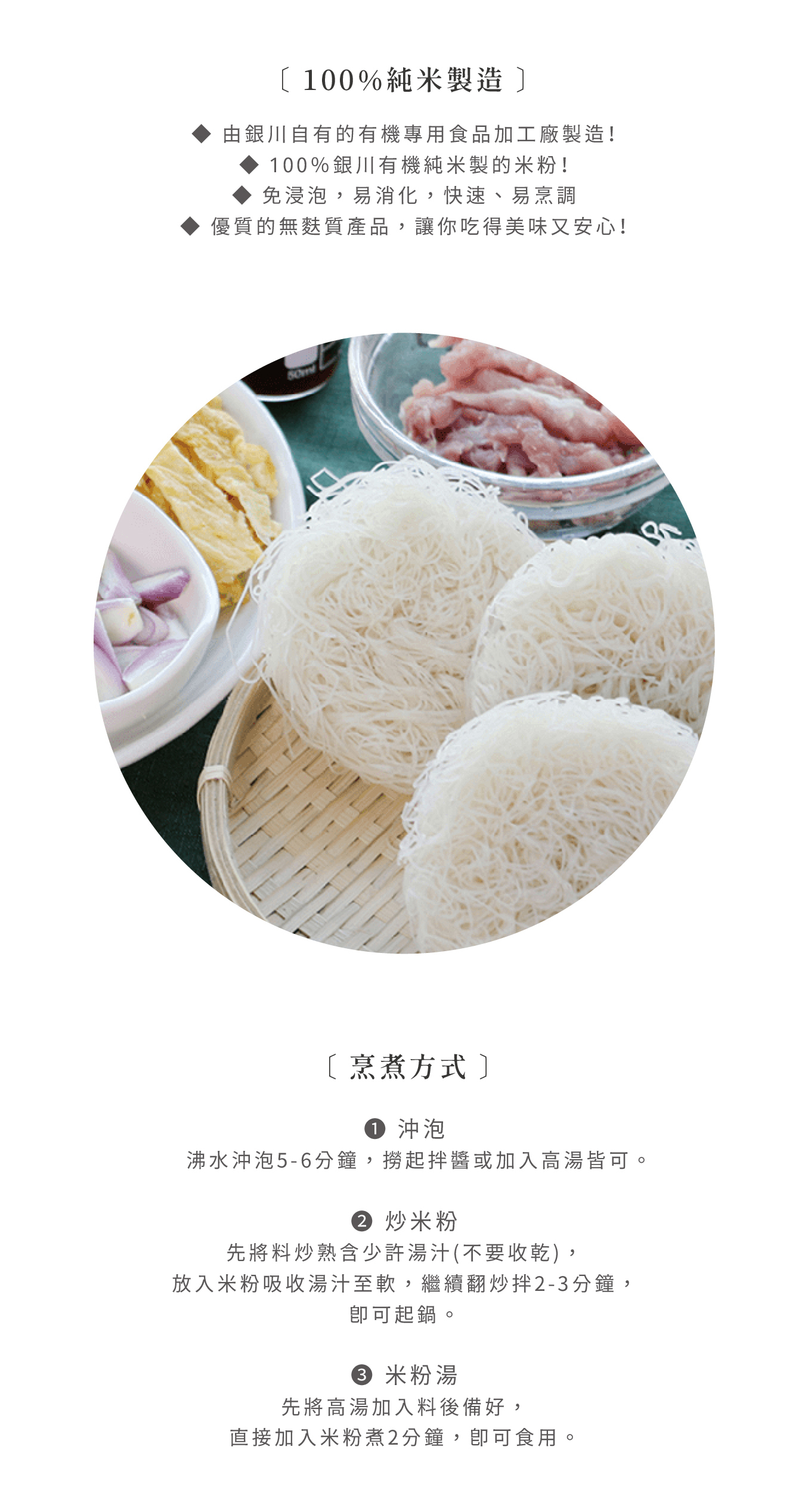 ◆ 100%有機純糙米製的米粉,完全無麩質過敏源,容易消化,快速、免浸泡,易烹調!